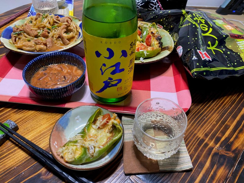 さて、純米原酒「小江戸」をいただきました。割と近くのお店で、埼玉の地酒コーナーをみると、お酒の紹介に書いてある説明では淡麗なお酒が多い印象です。その中でやや濃醇と書いてあったものを選びました。川越市の小江戸鏡山酒造さんのところのお酒とのこと。ラベルが黄色いですが、中味もすこし黄色っぽい感じがして、またなかなかステキでした。