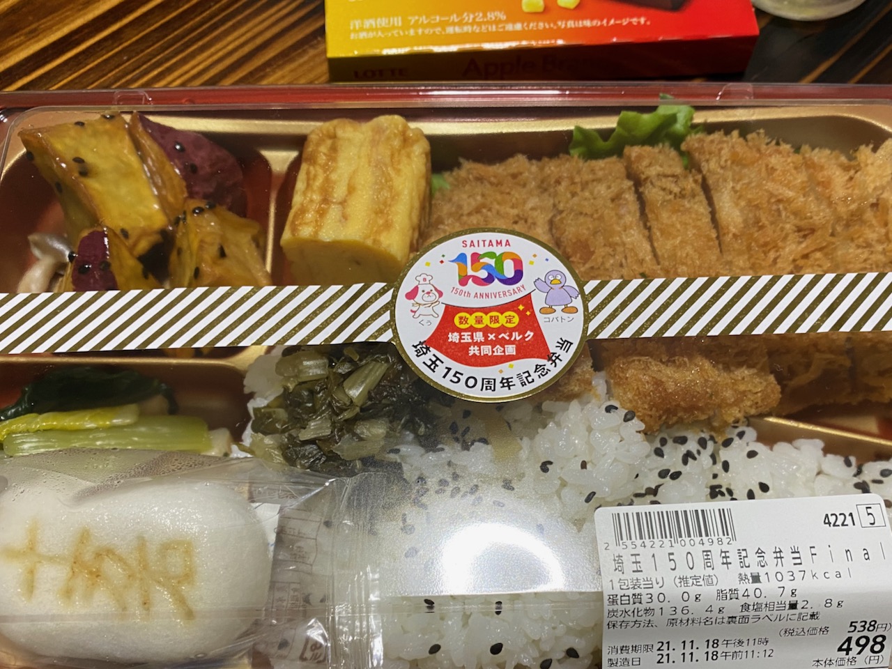 埼玉150周年記念弁当、弁当の中に十万石まんじゅうが X Facebook LINE コピー 2021.11.19 埼玉150周年記念弁当Finalを夕食にしました。 埼玉県とベルク(スーパー)の共同企画で販売されています。豚カツが乗って、大学いもがデザートでしょうか、と思ったら、さらに、十万石まんじゅうが入っていました。